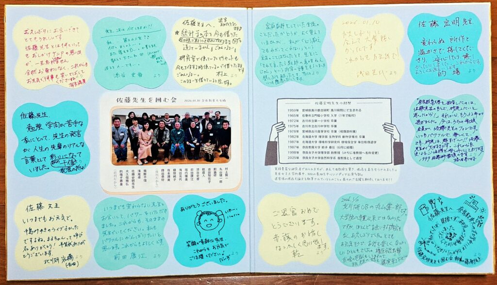2026年1月10日の食事会開催中に、参加者のみなさんにご協力いただきましたメッセージカードと、飛び入り参加の先輩も含む記念撮影、そして二次会にて佐藤先生ご本人に確認しながら記録しました経歴(間違っていたらごめんなさい)を色紙にまとめました。先生のお手元に無事届いたとのことです。そして、先生はご自宅の研究部屋に掲げてくださるとおっしゃっています!(2026.01.17 幹事:藤原)